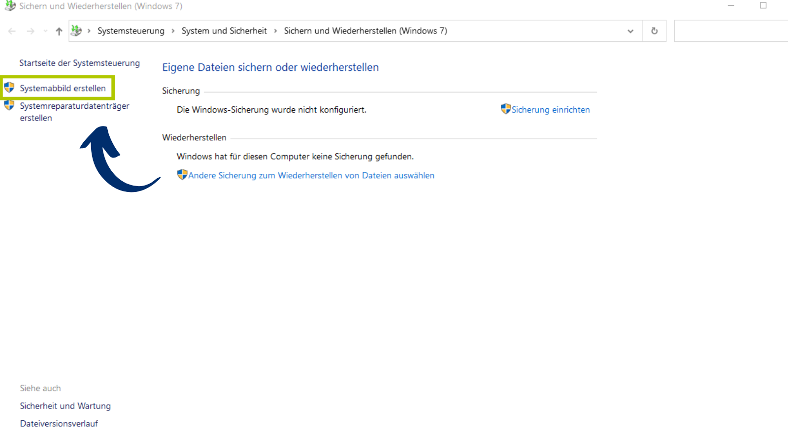 Alternativ finden Sie diese Optionen über die „Systemsteuerung“, „System und Sicherheit“ und „Sichern und Wiederherstellen (Windows 7)“.