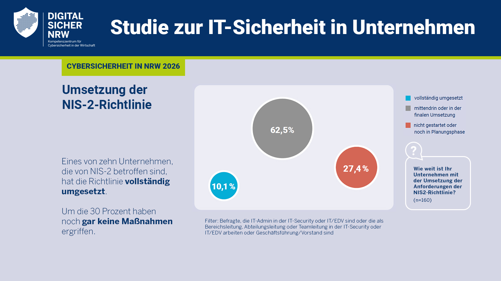 Besonders kleine und mittlere Unternehmen sehen Nachholbedarf. Sie bewerten den Reifegrad ihrer IT-Sicherheit niedriger als Großunternehmen und schätzen ihre Sicherheitskultur schwächer ein. Zudem stuft knapp die Hälfte aller Unternehmen den Fachkräftemangel im Bereich IT-Sicherheit als hoch oder sehr hoch ein.